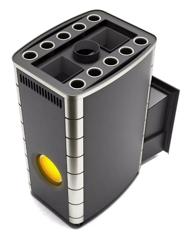 Быстрый нагрев парилки обеспечивает двухрядный десятицилиндровый теплообменник, который значительно увеличивает поверхность нагрева печи, не изменяя ее габариты. Глубокая закрытая каменка прогревается пламенем со всех сторон, обеспечивая качественный прогрев каменной закладки.