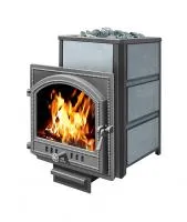 Конвекционно–вентилируемая облицовка, изготовленная из экологически чистой горной породы , который обладает большой теплоёмкостью, что позволяет камню в короткие сроки нагреваться и максимально долго удерживать стабильную температуру в парильном помещении, а также гасить жёсткое инфракрасное излучение Камень обладает исключительными лечебными свойствами: помогает при головных болях, при нестабильном артериальном давлении, при простудных заболеваниях, воспалительных процессах в почках и пищеварительной системе, снимает повышенную возбудимость и нервозность, сглаживает эмоциональные всплески. Облицовка из натурального камня при нагреве способна аккумулировать тепло, что гарантирует максимально равномерный прогрев и сохранение тепла Банная печь ЛЕГЕНДА 22 (205) укомплектован чугунной каминной, самоохлаждаемой дверцей Везувий 205 с большим жаропрочным стеклом «SHOT ROBAX», с оборудованной системой самоочистки, что позволяет визуально контролировать горение и любоваться видом живого огня. Данная печь рассчитана на объем парильного помещения 12-24 м3.